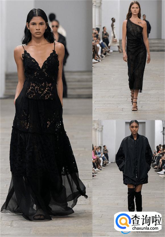 此外,该系列还展现了简约干练的黑色系穿搭,包括套装、背心式上衣、短裙等,同时还有不少亮点为套装增加了特色,如露腰、设计感腰头和廓形感裤装等休闲造型。在黑色连衣裙上,设计师采用了吊带和单肩式斜肩设计,同时在面料上融入了蕾丝和镂空元素,让简约黑色系穿搭更显性感和优雅。