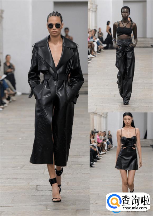 在面料的选择上,Ermanno Scervino 2023春夏系列使用了黑色皮革面料和浅色针织面料。黑色皮革面料的光滑感为服装增加了更多的帅酷气质,线条也显得刚毅。在这个系列的设计中,黑色皮革面料与风衣元素的大衣外套、吊带式裙装和一些宽松的直筒裤等款式相结合,更多地展现了酷感。而浅色针织面料则以奶白色为主,兼具温柔和优雅,钩织之中的纹理质感也更为鲜明。 - 02