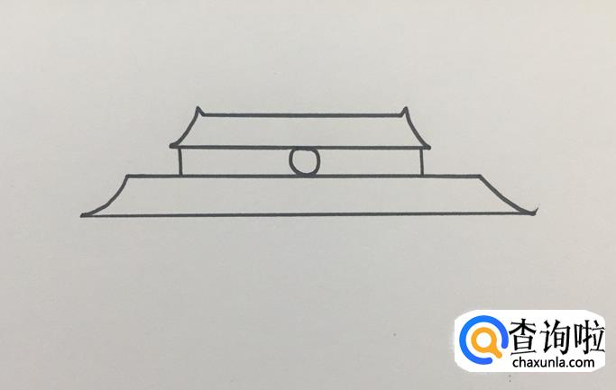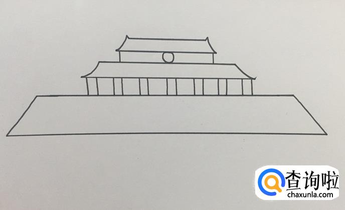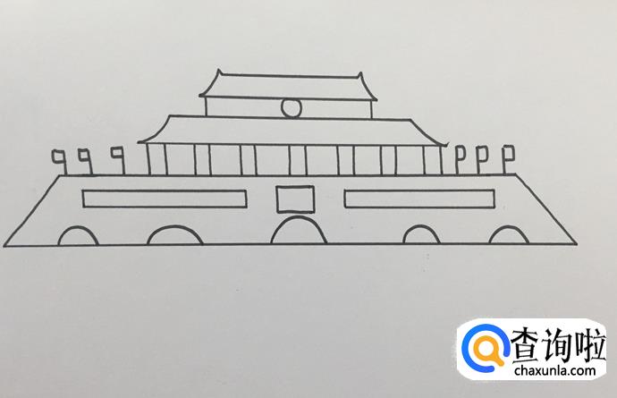 然后在画好天安门基本的外形之后,再往里添加细节,有五个小门还有一排旗帜,还有中间门上的一个正方形,再在正方形旁边画两个大小一致的长方形。