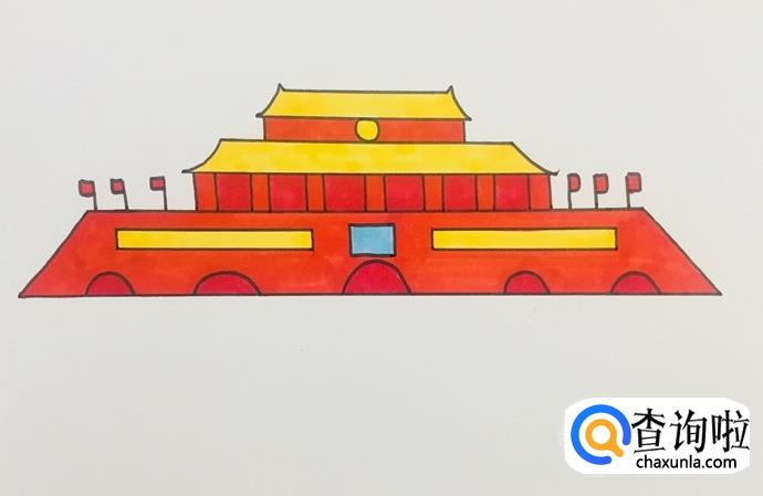 最后给天安门的房顶涂上黄颜色,墙体涂上红颜色,几面小旗子也不要忘记涂上红色。简单好看的天安门就完成了。