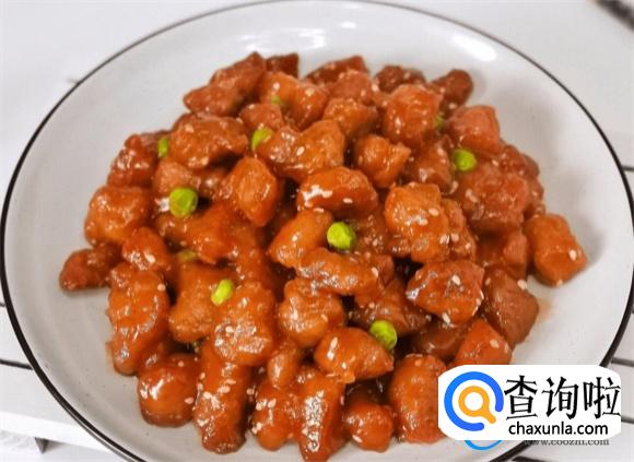 4、糖醋汁倒入锅中,烧汁浓稠倒入炸好的肉块,加白芝麻,熟豌豆快速翻炒均匀。