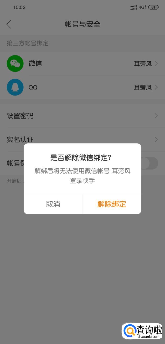 同意后就成功绑定微信帐号了,如果想要解绑也很简单,再次点击绑定了的微信图标,之后会弹出下图中出现的对话框,接着点击【解除绑定】按键。