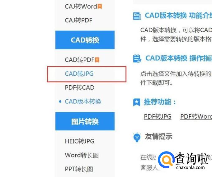 接下来,在打开的网页中,点击页面左侧“CAD转JPG”选项。