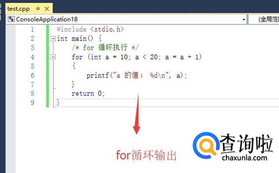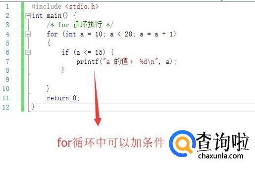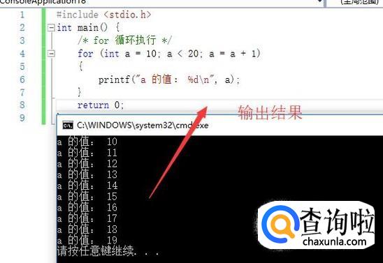 然后在主函数中,我们利用for循环打印10条数据,如下图所示,for循环的括号中接收三个参数,第一个是循环起始值,第二个是循环条件,第三个是循环条件的变更表达式
