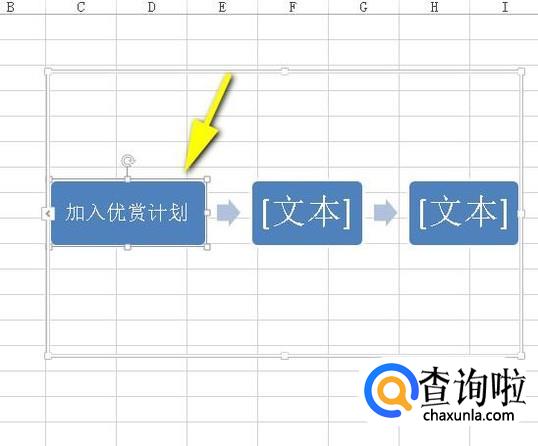选好流程图再点确定,那以,该流程图即显示在工作表中。鼠标双击左侧第一个方框,光标定位在这,然后,输入文字。