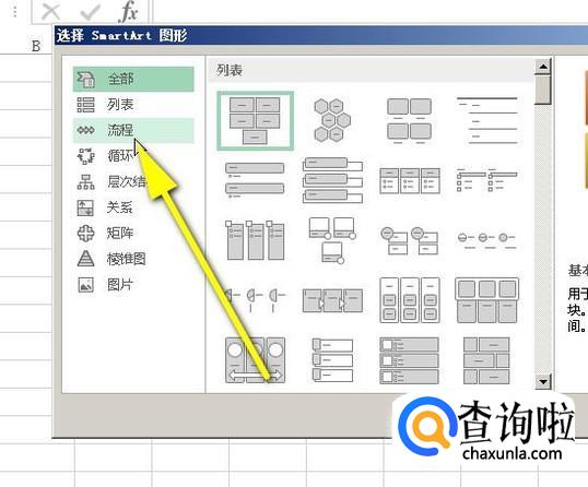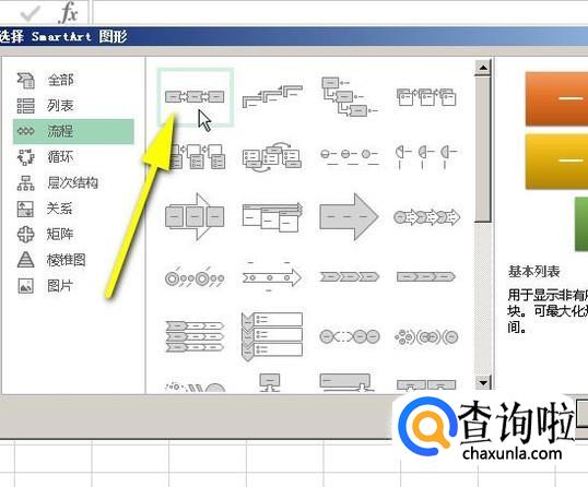 弹出smartart图形面板。点击左侧的:流程