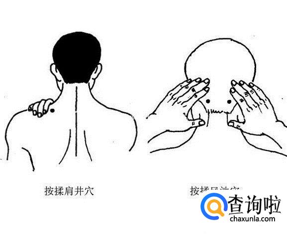 【按摩方法】被按摩者取坐位,按摩者站于身后,用双手拇指按压肩井穴约1分钟,然后按揉约2分钟,以局部感到酸胀为佳。