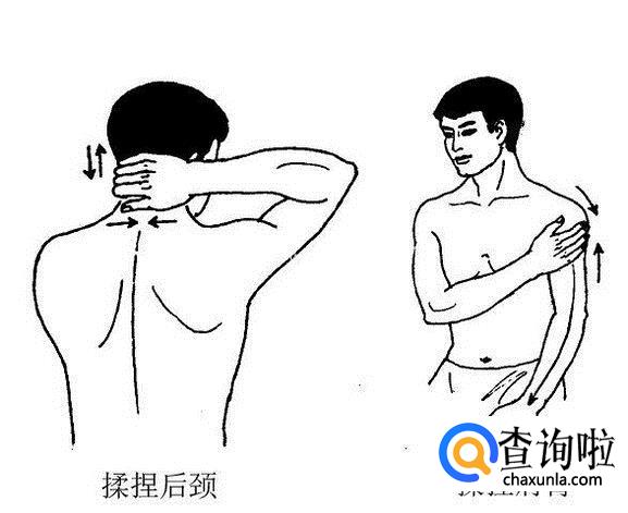自我捏揉颈部,肩部,手臂的方法。注意,捏的时候,大拇指略微张开,其余四个指头并拢,每次捏3到5分钟,如果患处出现酸胀感是最好的。