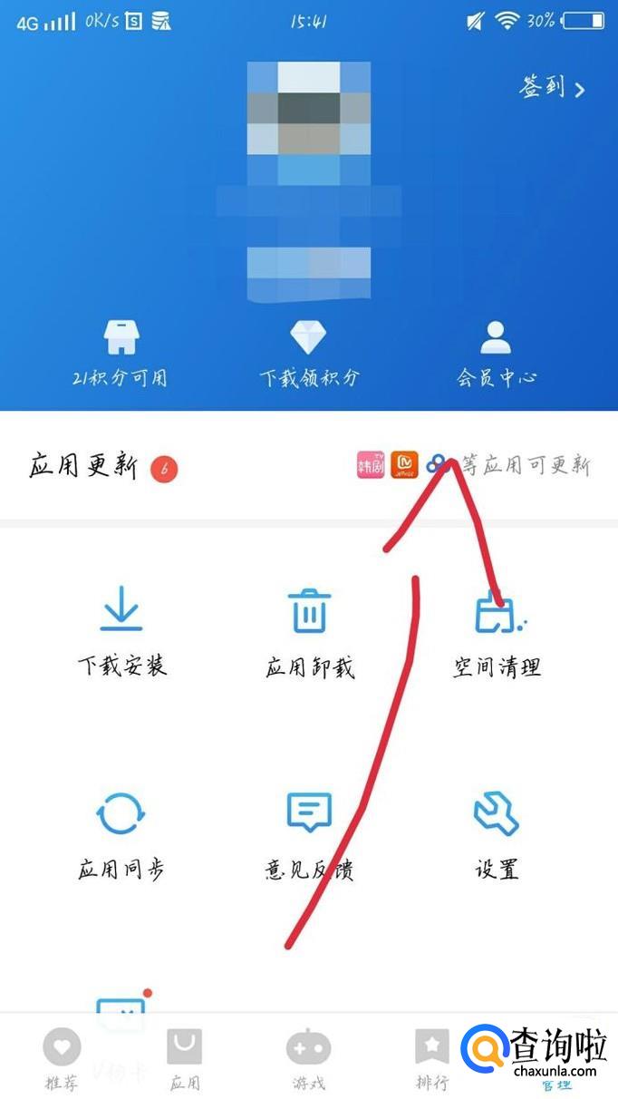 点击“应用更新”选项,如图1箭头所示。你会看到进入一个新的界面,如图2所示。