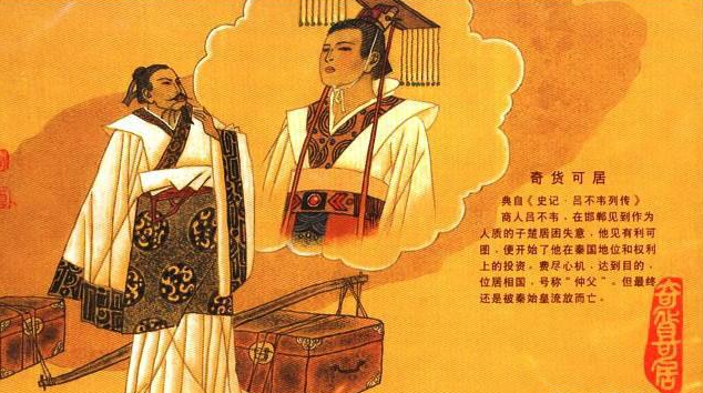 接着,吕不韦将所携带的珍宝托阳泉君献给华阳夫人,又另赠了重金给阳泉君。吕不韦将此法同样炮制,说动了华阳夫人的姐姐。由于吕不韦提出的是双赢策略,阳泉君和大姐经吕不韦一番点拨,马上找到姐姐华阳夫人,华阳夫人对阳泉君和姐姐的话立即照单全收。这样,吕不韦的主张经由这位阳泉君及其大姐而到达华阳夫人,通过华阳夫人的枕边风,再到达安国君,异人果然被确立为嫡嗣。几年以后,异人终于继安国君而登上国君的宝座,即就是后来的秦庄襄王,他的儿子便是中国历史上第一个皇帝——秦始皇,而吕不韦这位商人也就轻轻松松地成为中国封建社会的第一位宰相。