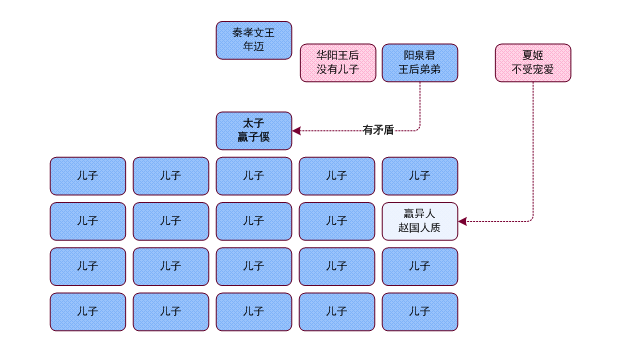 其时,秦昭襄王作为中国历史上在王位年限上位居第二的君主,执政多年后年已老迈,连原立太子都没有熬过老爸就客死魏国了,继立太子安国君即将成为秦国的最高掌权者。太子最受宠爱的妃子是华阳夫人,华阳夫人没有孩子,常言道:“母凭子贵”,没有儿子的宠妃,那地位是保不住的。一旦安国君继承王位,选定太子,太子之母即为后宫之首,华阳夫人的地位便要一落千丈了。吕不韦所要做的,便是要华阳夫人将异人过继为自己的儿子,并反以“子凭母贵”,确立为安国君的嫡嗣继承人。