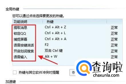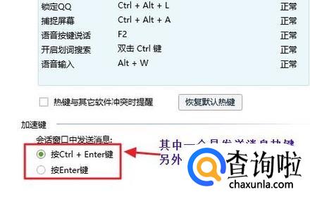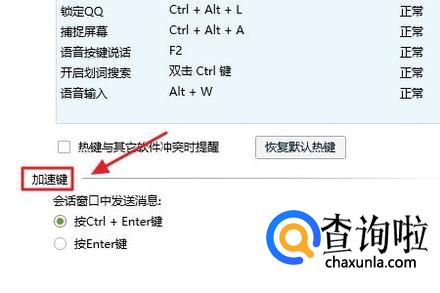 该页面的最下方有一项“加速键”,我们看到一共有两个选项可以用于发送消息,我们选中一个热键以后,剩下的那个就会自动默认为换行键了;