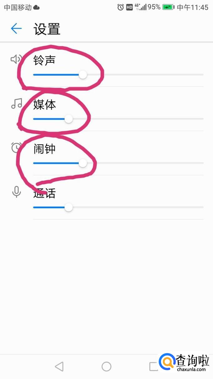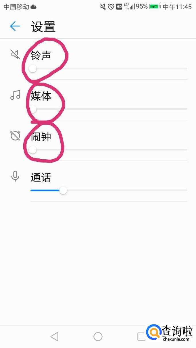可以看到铃声,闹钟,媒体的音量都是关闭的,把它们打开即可。这样手机就可以解决没有声音的问题了。