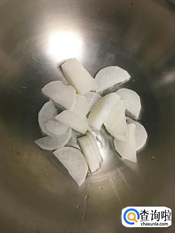 白萝卜洗净后去皮,切成小片,油锅烧热后,放入锅中,大火煸炒。