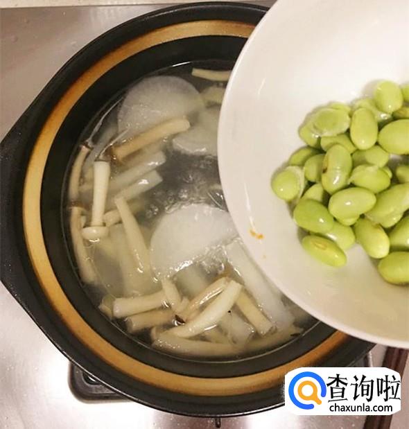 煮至菌菇变软后,加入洗净的毛豆米。