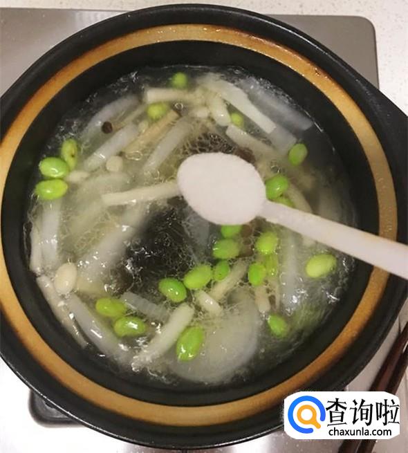当毛豆米软糯时,加入1小勺盐调味。