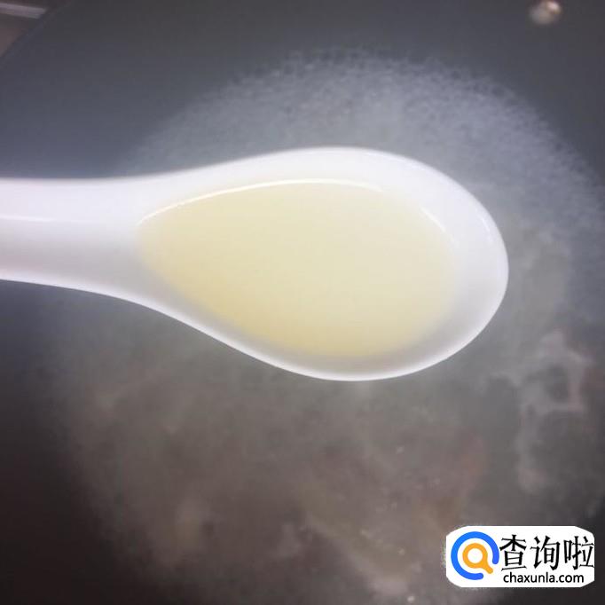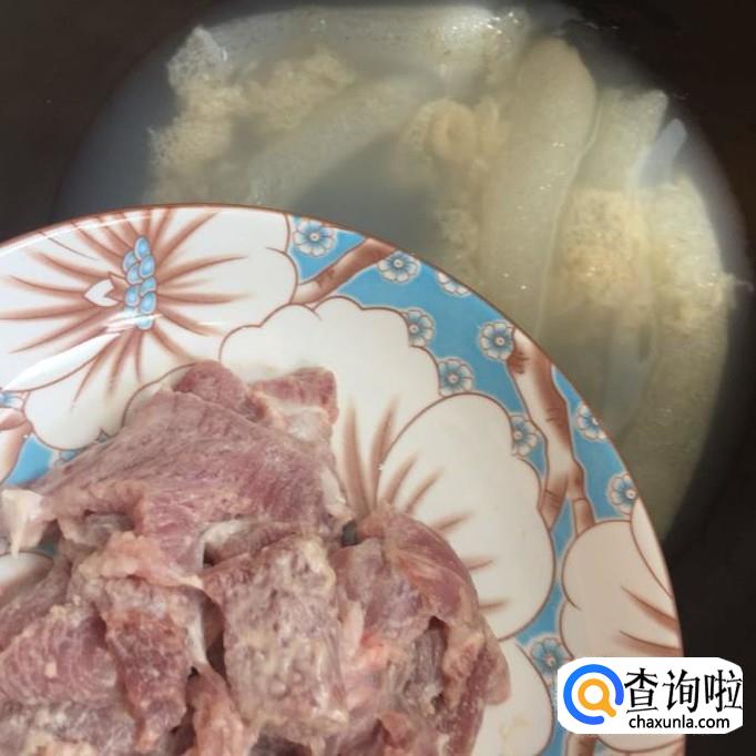 然后把瘦肉切成薄片并用适量的地瓜粉裹一下,接着把瘦肉导入锅中煮五分钟,如下图所示。