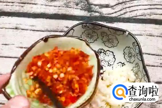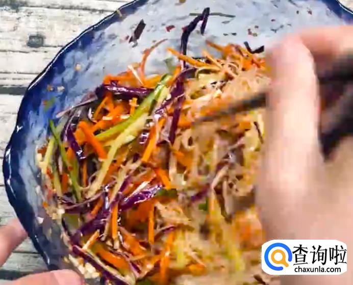 最后取碗,依次放入胡萝卜、紫甘蓝、黄瓜丝,再倒入蒜泥辣椒面,再加盐、鸡精、生抽、醋、香油、香菜、芝麻酱拌匀。