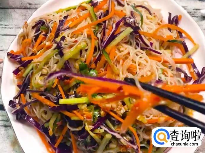 黄瓜、胡萝卜、紫甘蓝、粉丝、蒜、辣椒碎、花椒、盐、鸡精、醋、生抽、香油、香菜、芝麻酱