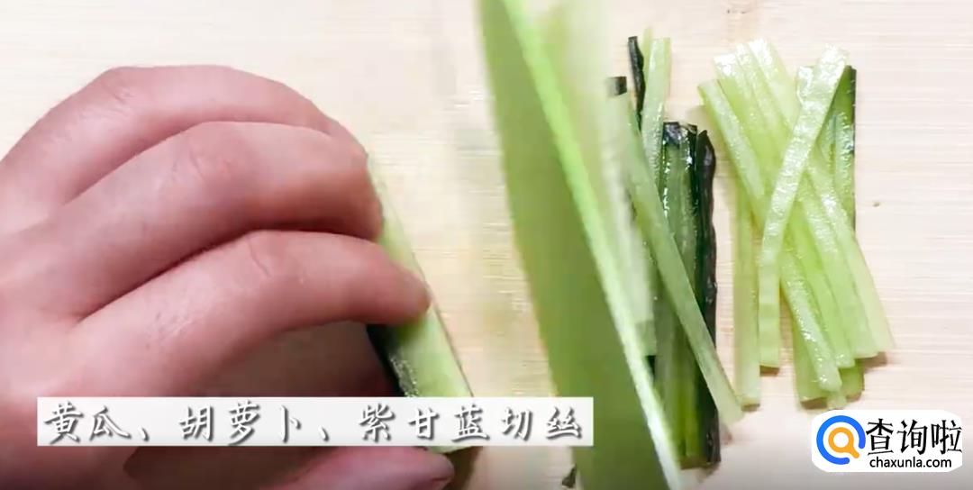黄瓜、胡萝卜、紫甘蓝切丝。