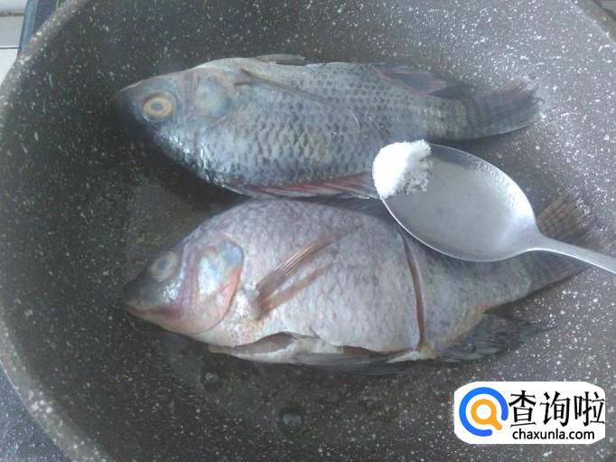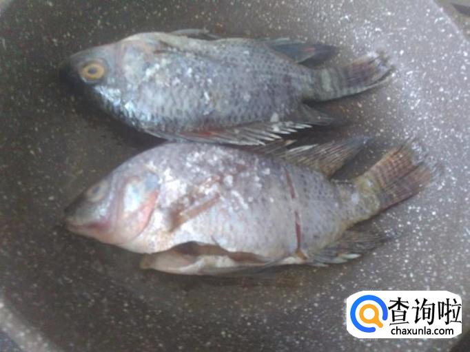 把鱼摆到锅里撒点盐,用小火煎6分钟左右。