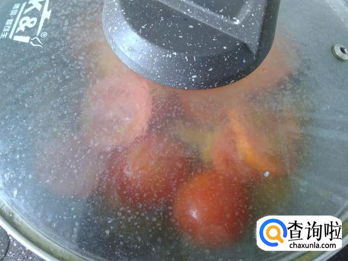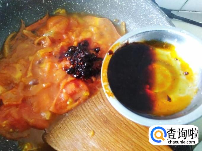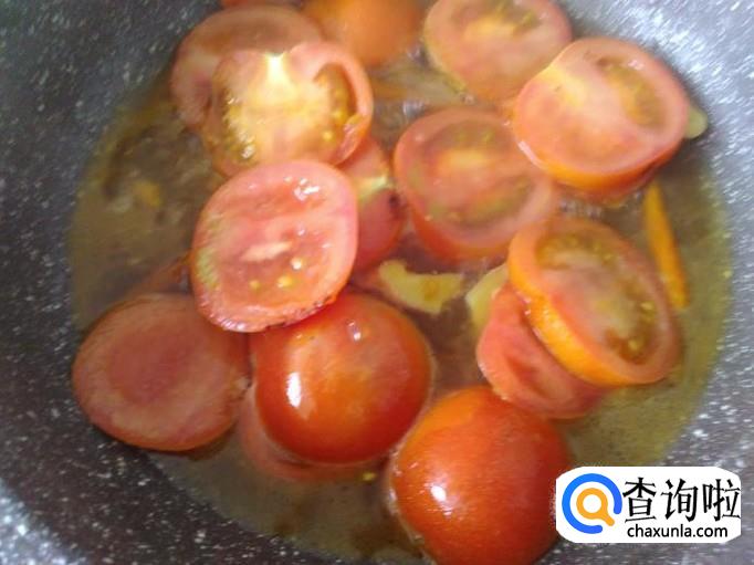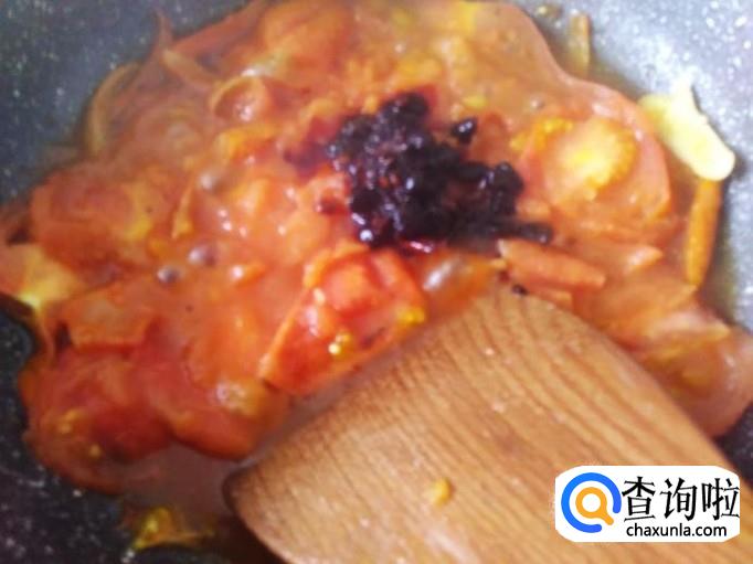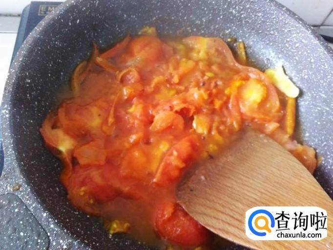 然后打开锅盖,用锅铲把番茄压成果泥。
