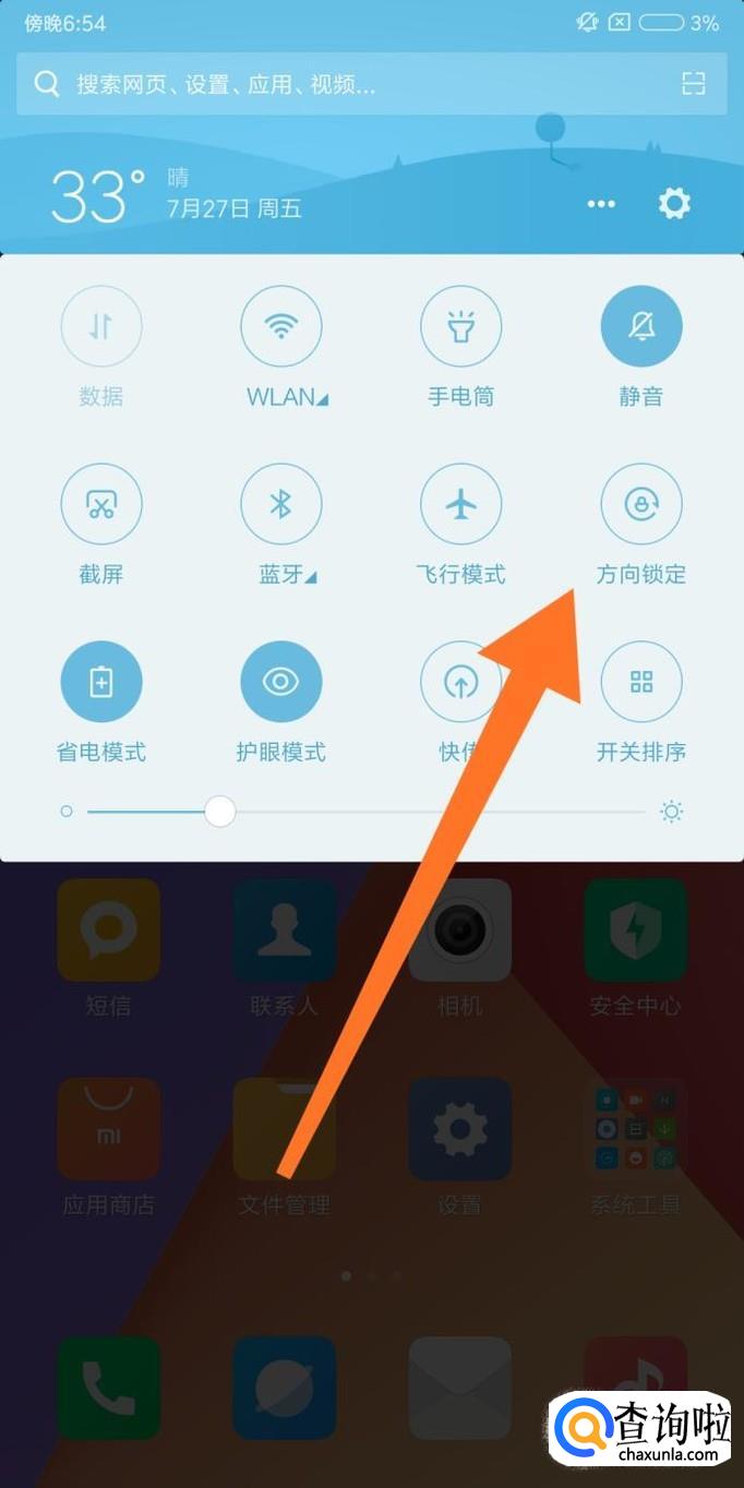 还可以直接下拉小米手机的通知栏,打开“方向锁定”开关,同样可以关闭屏幕自动旋转。