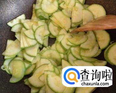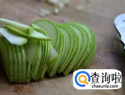 将笋瓜去掉根,切成半圆形的薄片,将蒜切成末。
