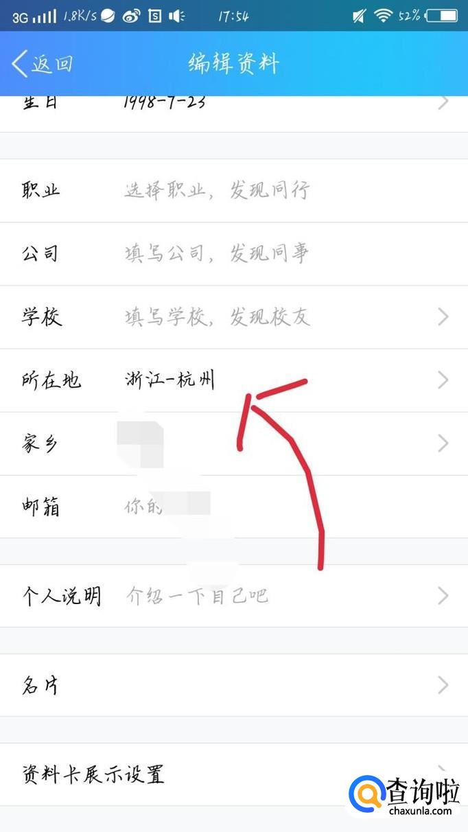向下滑动手机点击“所在地”这个选项,如图1箭头所示。你可以选择当前位置,你也能手动改变位置。