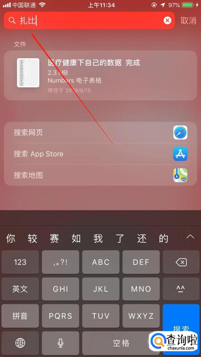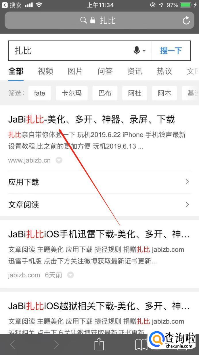首先,在手机搜索中输入“扎比”,进行搜索。