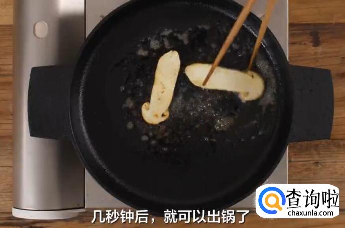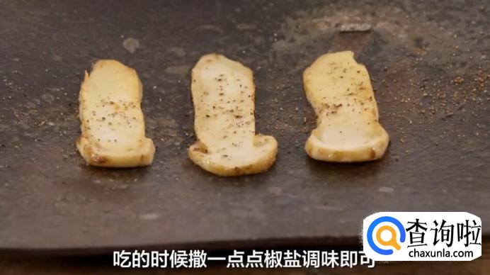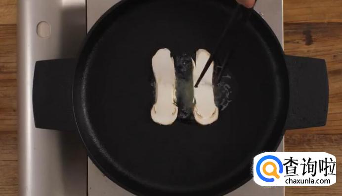 煎片刻,至松茸恢复平整后,再翻面,几秒钟后,即可出锅。