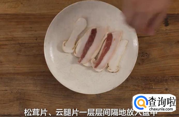 将松茸片和云腿片一层层间隔放入盘中。