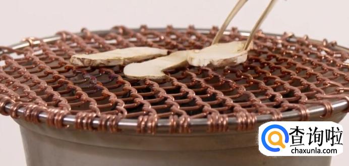 这种吃法和吃法一有点类似。炭火不要烧太旺,架上烤网,就可以放切片松茸了。
