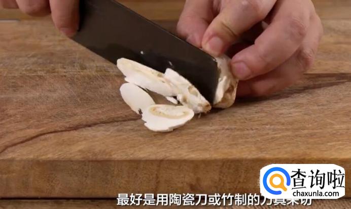 接下来将松茸切片,最好不要切太薄,最好是用陶瓷刀或竹制的刀具来切。