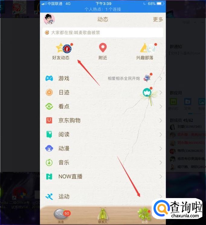 打开手机qq,点击右右下角的动态,在点击左上角的好友空动态。