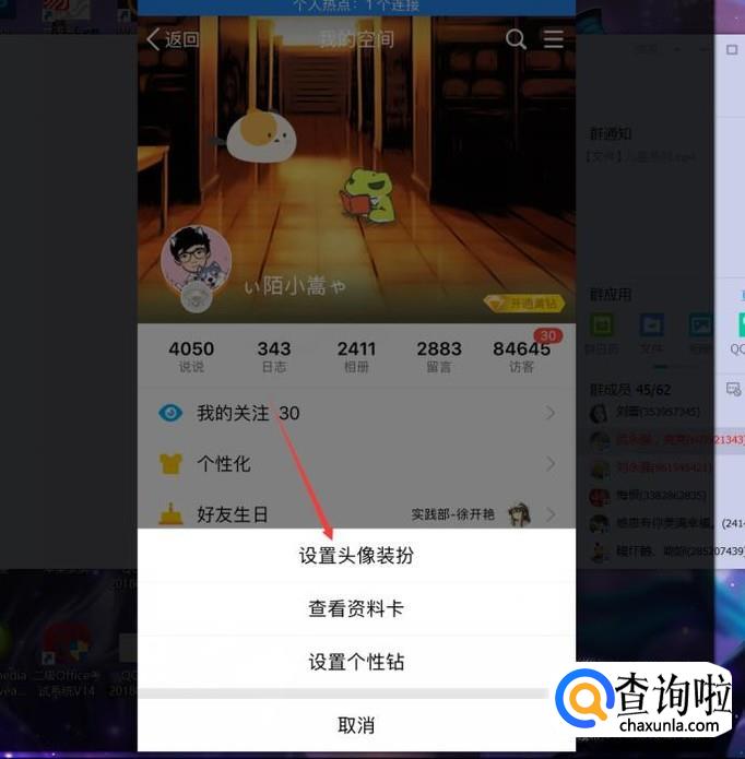 进入自己的空间后,再次点击头像,在弹出的页面中点击设置头像装扮。