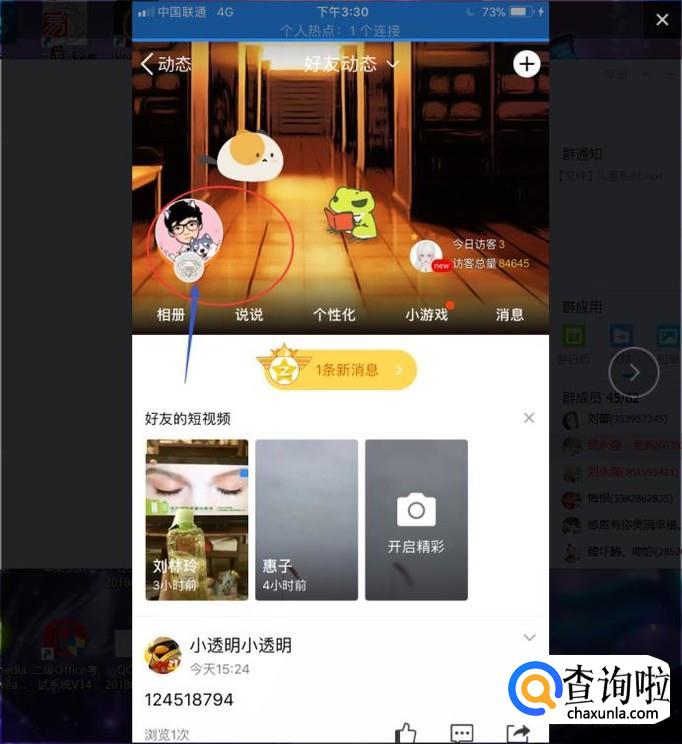 进入到好友动态以后,点击自己的头像,进入到自己的空间。