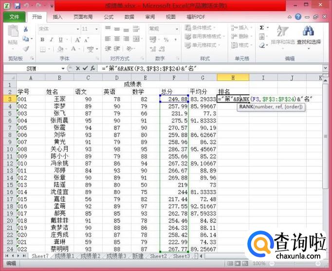 在H3单元格内输入函数“="第"&RANK(F3,F3:F24)&"名"