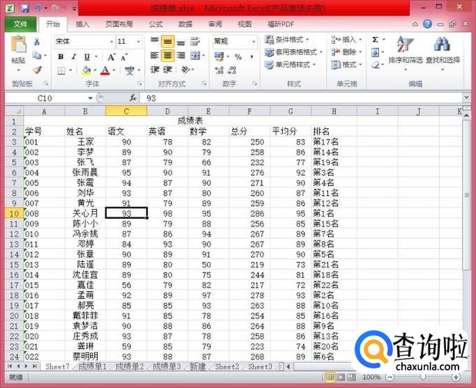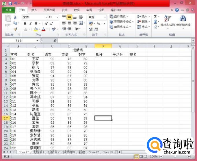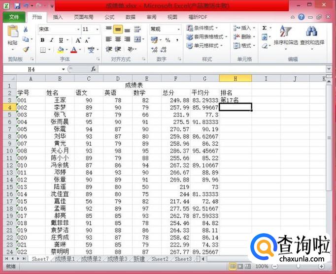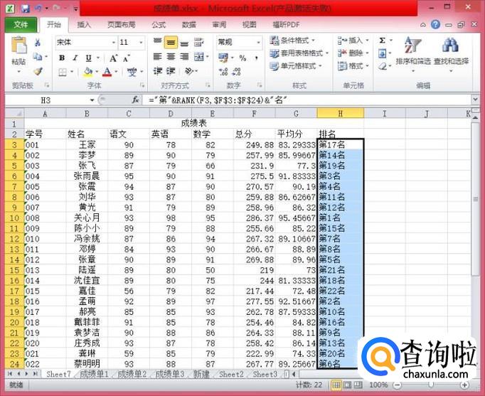 (此时你会发现排名是没有结果的,因为我们只算了一个总分和平均分)