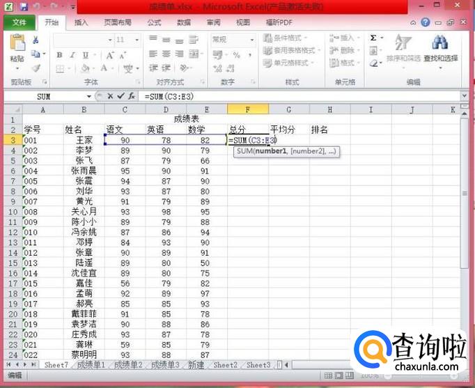 在F3单元格内输入函数“=SUM(C3:E3)”,然后按下“enter”键,完成总分的计算