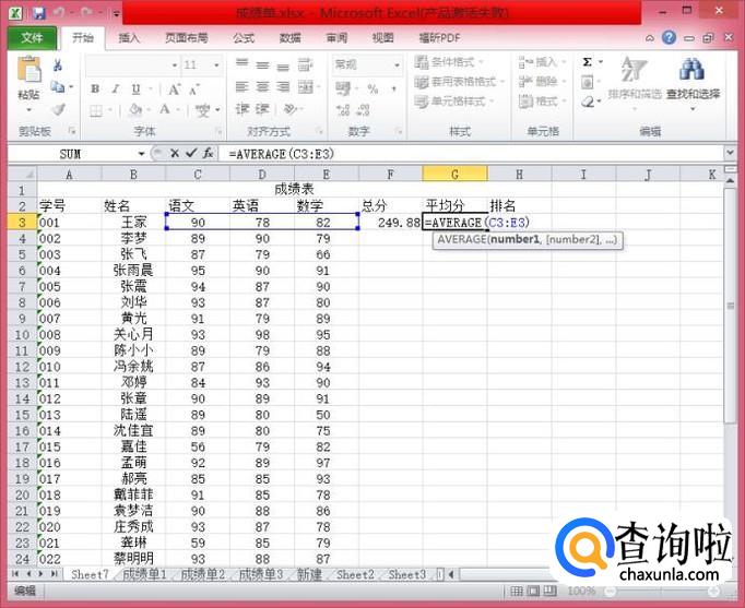 在G3单元格内输入函数“=AVERAGE(C3:E3)”,然后按下“enter”键,完成平均分的计算