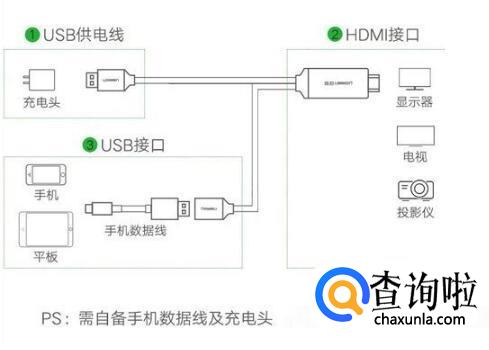 手机通过数据线路,一头插入手机的数据插口,另一头USB插口插入绿联这款设备的USB母口内。这样的设计可以搭配lightning插口的苹果手机,也能适配TYPE-C插口的手机和M-USB插口的设计,包括了目前主流手机的数据插口形式。想要把手机连接上电视,那么我们就需要明白两者之间的连接,这里把具体的连接图展示如下,大家可以先看一下线路。