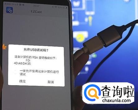 安装完成APP后,根本不需要启动APP,在连接绿联这款手机输出HDMI同屏转换器后,直接在手机上弹出是否允许USB调试的提示窗口。勾选一律允许后,点击确定按钮即可。