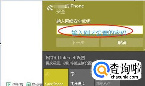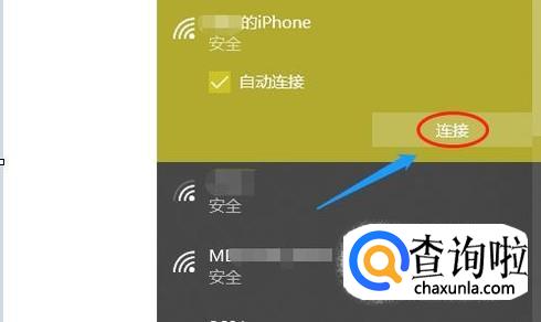 点击此热点以后,会在右下角显示一个“连接”选项,点击此项以后将我们在手机热点处设置的密码输入进去,这样电脑就可以连接到手机WiFi来上网了;