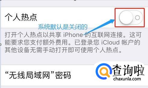 一般来说,个人热点默认是关闭状态,我们手动将其调整为打开,然后点击下方的“无线局域网”密码,就可以给这个热点设置一个密码了,设置好以后点击右上角完成;