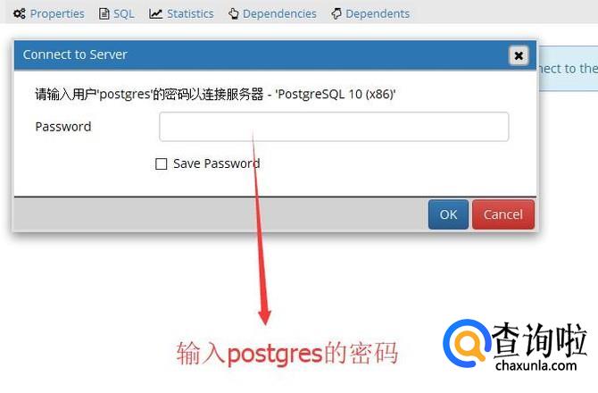 在弹出的Connect to Server界面中输入postgres用户的密码,然后点击OK按钮,如下图所示