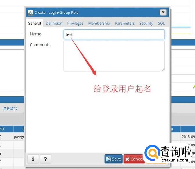 然后切换到Definition页卡,给登录用户设置一个登录密码,如下图所示,注意Connection limit要设置为-1