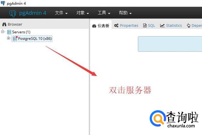 首先打开Postgresql的管理工具pgAdmin4,接着双击服务器名称,如下图所示