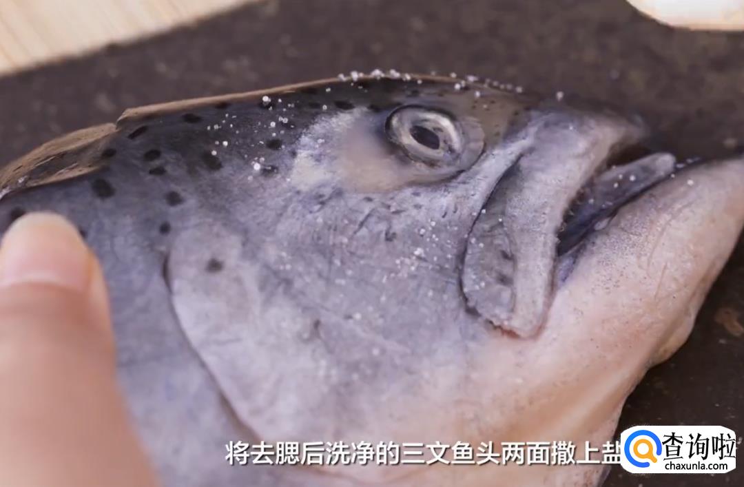 将三文鱼头洗干净后,两面都撒上盐和白胡椒粉腌制15分钟。