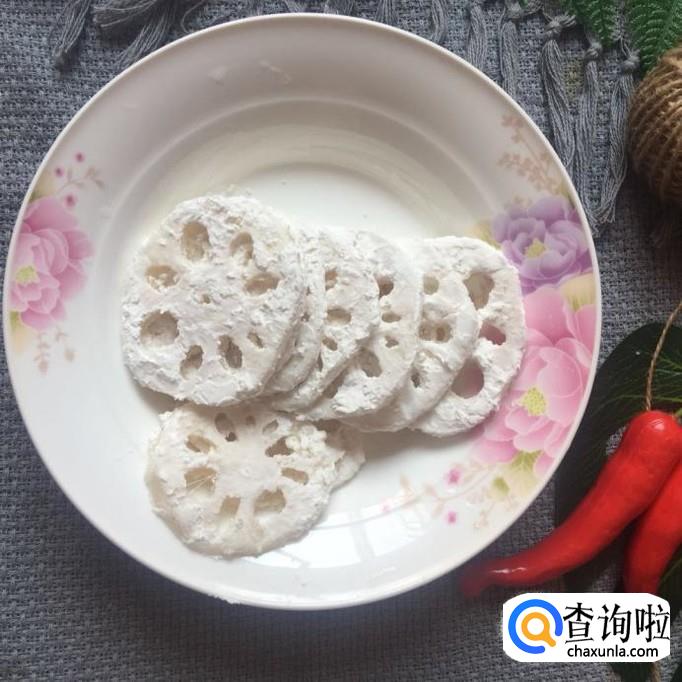 接着将煮好的藕片用适量的玉米淀粉裹一下,如下图所示。